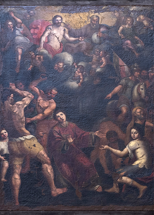 La peinture, initialement placée dans le deuxième autel du bas-côté gauche de l’ancienne cathédrale de Milazzo, est aujourd’hui visible sur le mur du presbytère dans la matrice moderne. Sérieusement incomplète sur les marges, peut-être à cause des dommages causés par le transfert de lieu, elle a été adaptée, avec l’ajout de deux inserts en bois, à un cadre en bois riche sculpté de motifs de feuilles luxuriants du goût baroque de la fin du XVIIe siècle. La scène surpeuplée fait référence au moment où le protomartyr Étienne, agenouillé, avec le dalmatique d’un diacre et le regard tourné vers la Trinité, subit la violence de la foule et la lapidation. Le jeune homme en lorica, qui désigne le saint en regardant vers l’observateur extérieur, est Saul, le futur saint Paul, à ses pieds, selon le récit évangélique, les témoins du martyre déposèrent leurs manteaux (Actes des Apôtres, 7, 58).