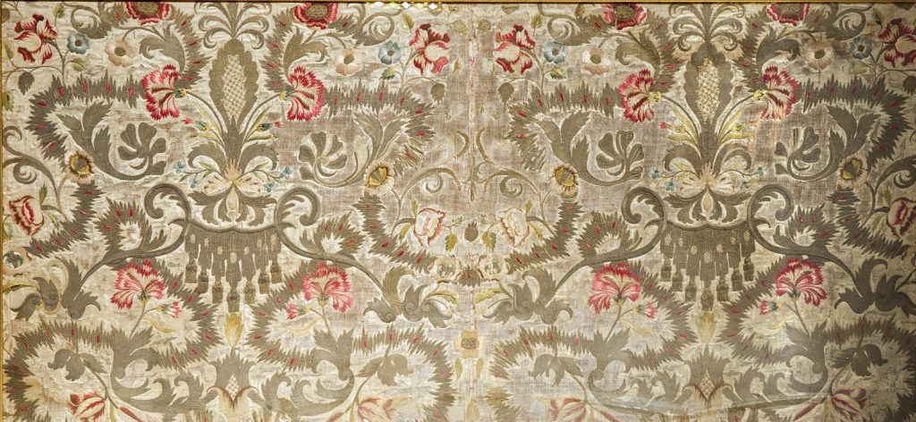 十八世纪的白色和彩色丝绸和银线前台,带有花朵和流苏